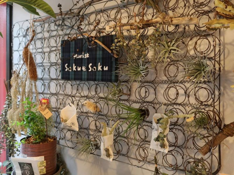 saku sakuは、かつてharu+という雑貨屋の一角を借りて始まったお花屋さんです。2畳ほどの小さな空間とガレージでの営業は短い期間ながらも店主の原点となり、その経験を経て2019年1月11日に現在の店舗へ移転しました。